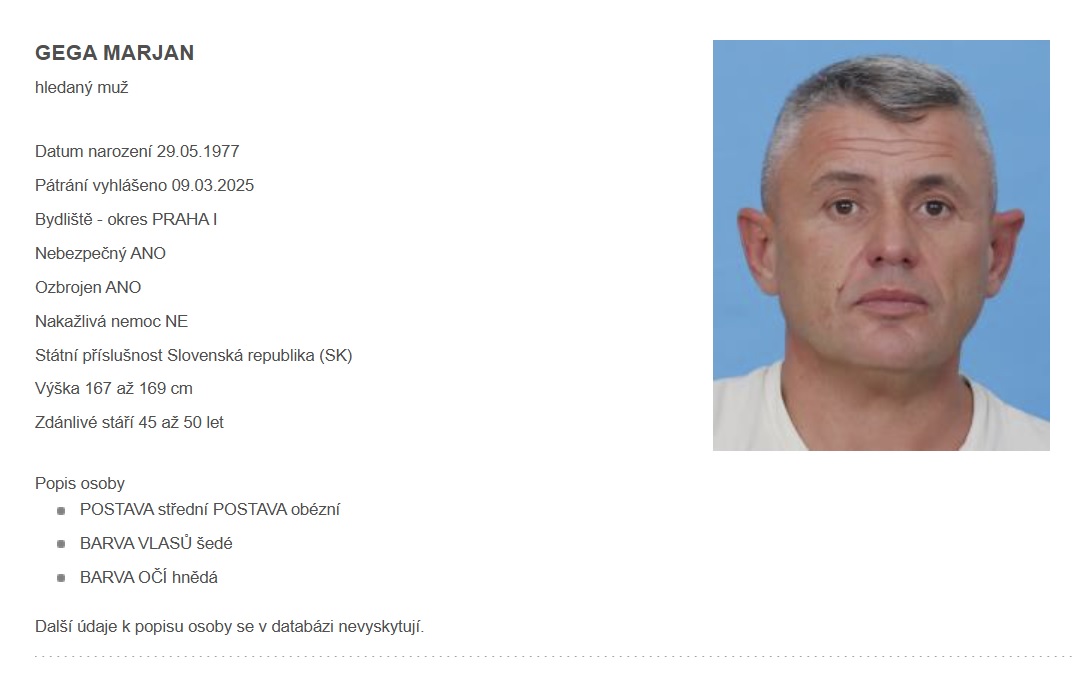 Пражская полиция обратилась к общественности за помощью в розыске 48-летнего гражданина Словакии по имени Гега Марджан (GEGA MARJAN). Суд выдал ордер на его арест. Мужчина может быть вооружен боевым пистолетом.