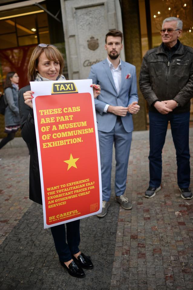 Третий плакат выполнен в красном цвете с пятиконечной звездой по центру. Надпись на нем гласит: «Эти машины такси являются частью экспозиции музея коммунизма. Хотите окунуться во время тоталитаризма? Астрономические цены за дешевые услуги».