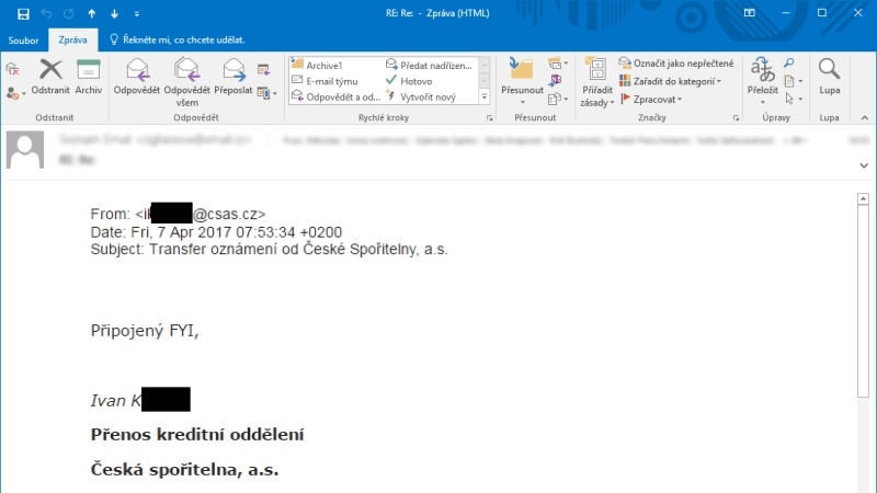 На первый взгляд письмо действительно выглядит так, будто его отправил один из сотрудников банка. Злоумышленники подменяют реальный адрес отправителя на csas.cz, который обычно использует Česká spořitelna для связи с клиентами.