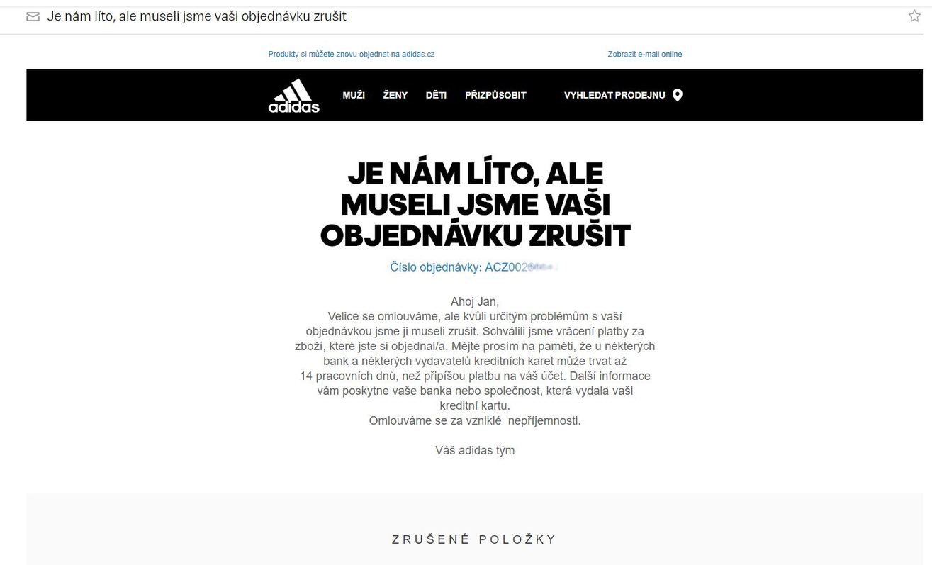 Компания Adidas продолжает решать проблему, возникшую из-за технического сбоя в чешской версии своего интернет-магазина. На прошлой неделе на сайте произошла путаница с валютами, и некоторые вещи, например кроссовки, несколько часов стоили не 40 евро, а 40 крон.