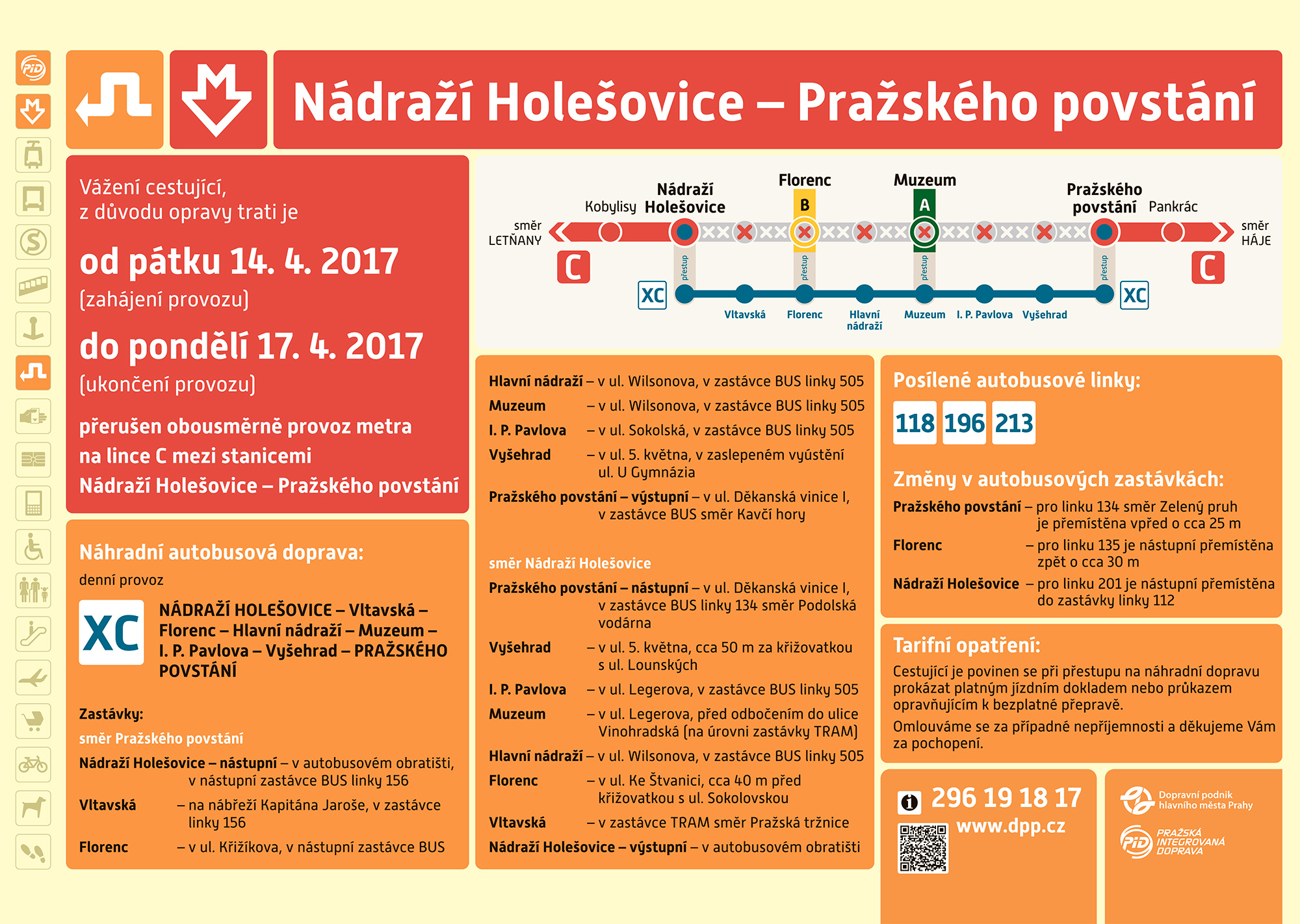Утром в пятницу, 14 апреля, в Праге на четыре дня закроют участок Nádraží Holešovice – Pražského povstání «красной» ветки метро. Мера, вызванная необходимостью замены рельсов, продлится до 17 апреля включительно.