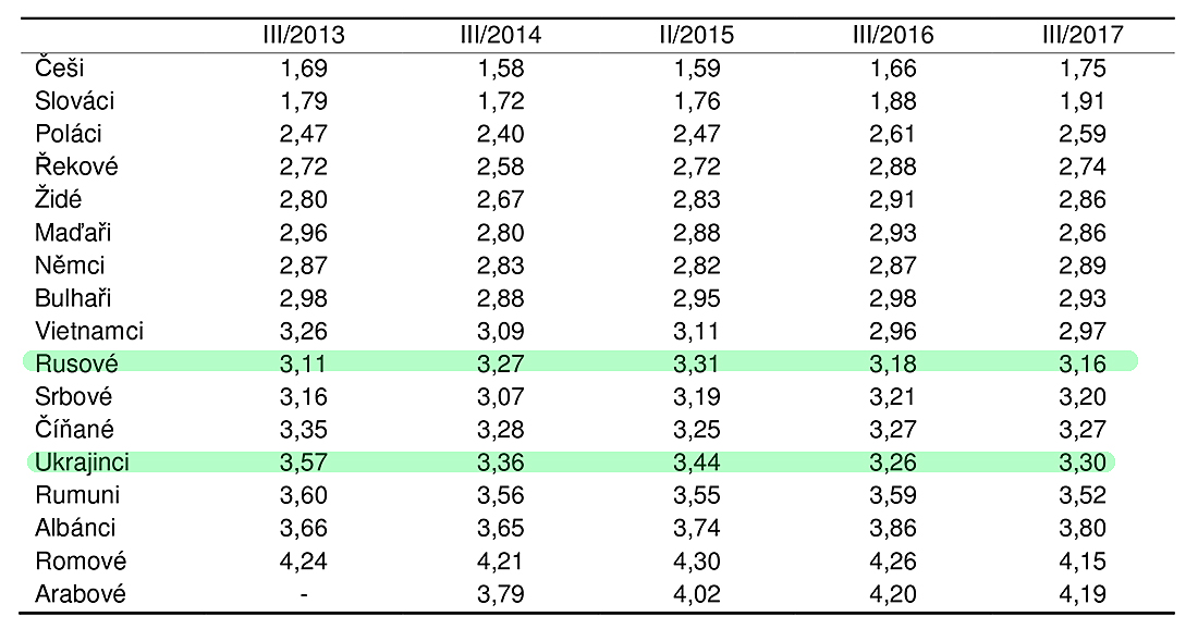 Лидерами своеобразного рейтинга ожидаемо стали сами чехи (1,75 балла). Далее следуют словаки (1,91), поляки (2,59) и греки (2,87). В конце списка - албанцы (3,8), цыгане (4,15) и арабы (4,19).