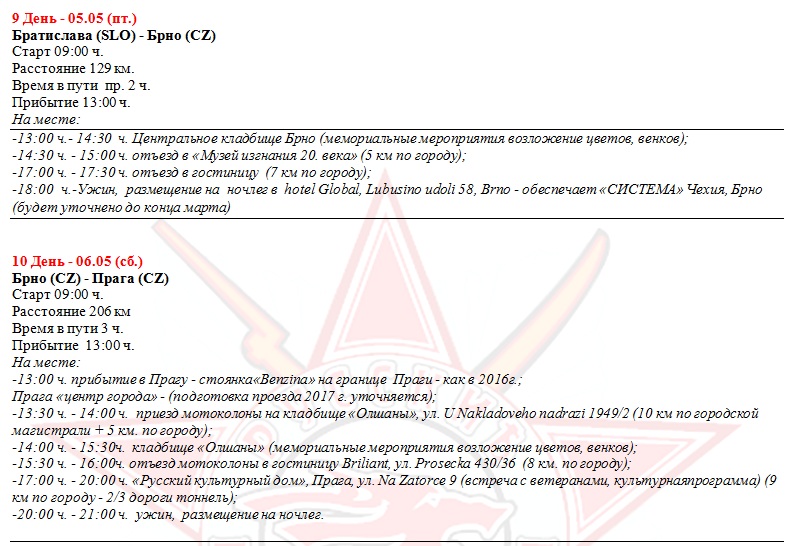Байкеры стартовали из Москвы. Они планируют посетить мемориалы и памятники павшим советским солдатам в Беларуси, Польше, Словакии, Чехии и Германии. В общей сложности мотоциклисты намерены преодолеть более шести тысяч километров и к 9 мая оказаться в Берлине, чтобы возложить цветы к памятнику Воину-Освободителю.