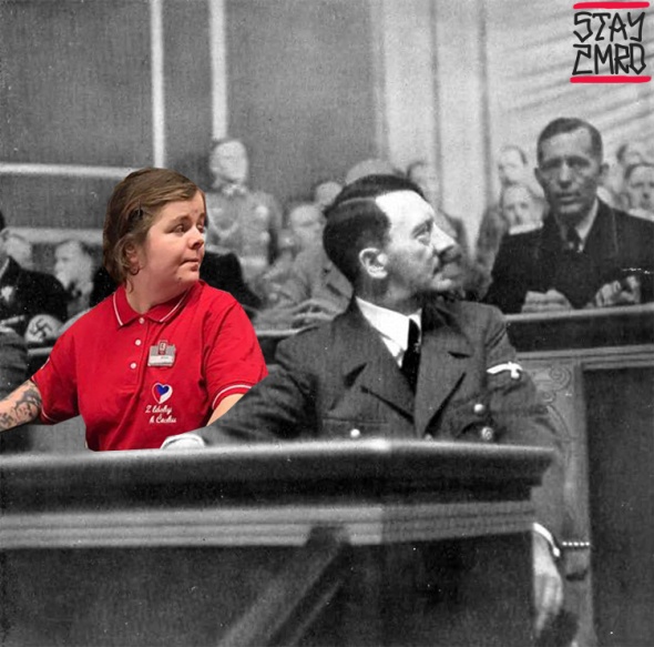 На этом коллаже фюрер за кассой задает покупателю рядовой вопрос об участии в рекламной акции: «Вы собираете баллы?».