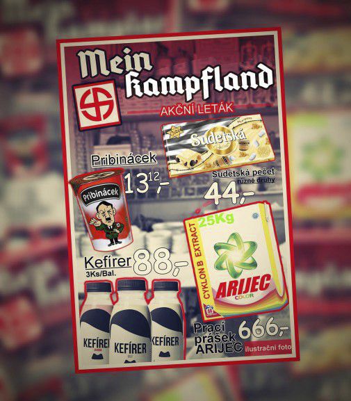 Другие умельцы "скрестили" рекламный каталог торговой сети и знаменитую книгу Адольфа Гитлера "Моя борьба" (Mein Kampf). Стиральный порошок Ariel превратился в «Арийца»,  шоколад Studentská - в Sudetská (намек на нацистскую оккупацию Судетской области Чехословакии), а на передний план авторы вынесли реально существующий кефир Kefírer по цене в 88 крон (отсылка к лозунгу 14/88 белых националистов).