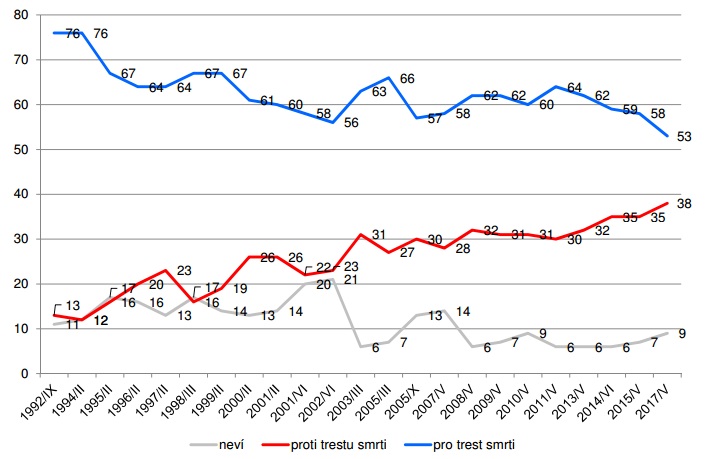 В течение последних 25 лет сильнее всего за смертную казнь чешские жители выступали в первой половине 90-х (76%).