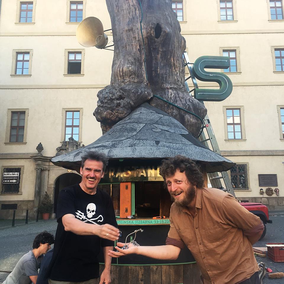 Киоск создал известный чешский художник Франтишек Скала. Он простоит на площади до сентября нынешнего года. Обслуживать сказочное заведение будет известный пражский предприниматель Ондржей Кобза.