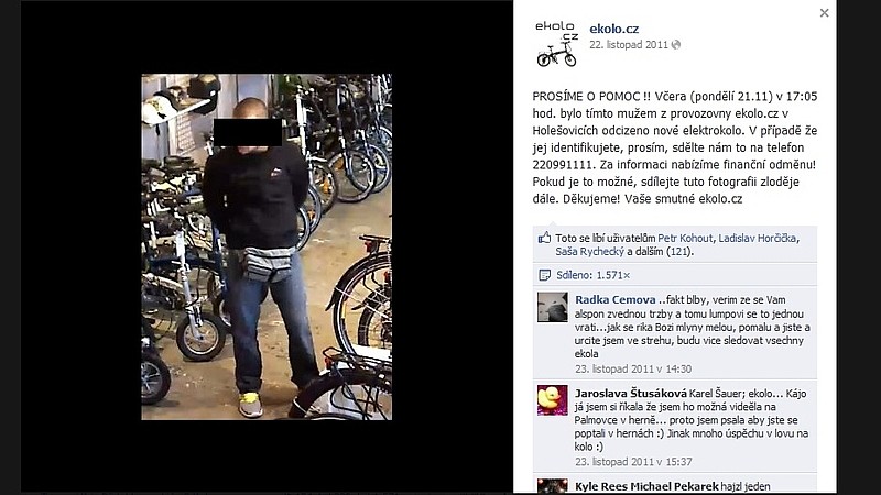 Сама кража состоялась осенью 2011 года. Компания обнародовала кадр с записи камеры видеонаблюдения и попросила пользователей социальной сети помочь разыскать преступника. Мера дала результат – в скором времени полиция нашла велосипед на одном из рынков Праги 8 и задержала вора, которого позднее приговорили к реальному тюремному сроку. Тогда владелец фирмы Якуб Дитрих заявил, что поймать преступника удалось благодаря информации, полученной от пользователей Facebook.