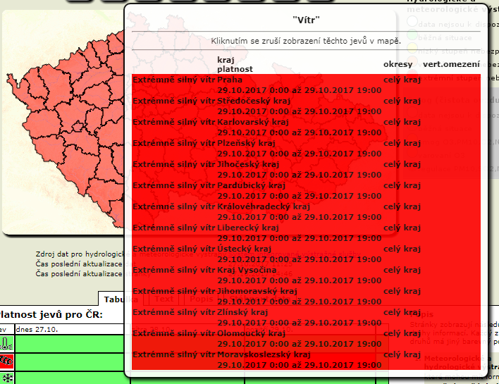 Чешский гидрометеорологический институт опубликовал предупреждение об экстремально сильном порывистом ветре. Синоптики прогнозируют, что в воскресенье, 29 октября, его скорость в большинстве областей страны достигнет показателей урагана и составит около 125 км/ч. При этом в горных областях она составит – 160 км/ч.