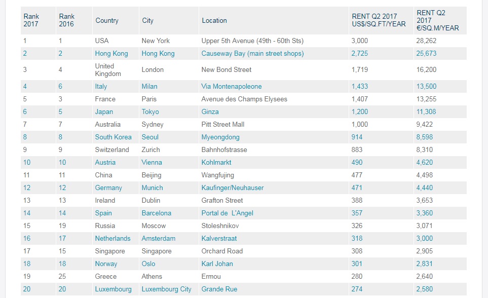 Топ-20 самых дорогих торговых улиц мира в 2017 году: