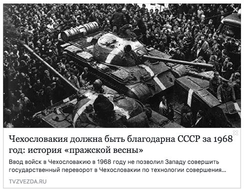 Ранее 21 ноября на сайте телеканала «Звезда» появилась публикация под заголовком «Чехословакия должна быть благодарна СССР за 1968 год». В ней автор Леонид Масловский утверждает, что военная операция «Дунай» в 1968 году не позволила Западу провести государственный переворот в Чехословакии, и тем самым предотвратила массовое кровопролитие. Позже статья была удалена.