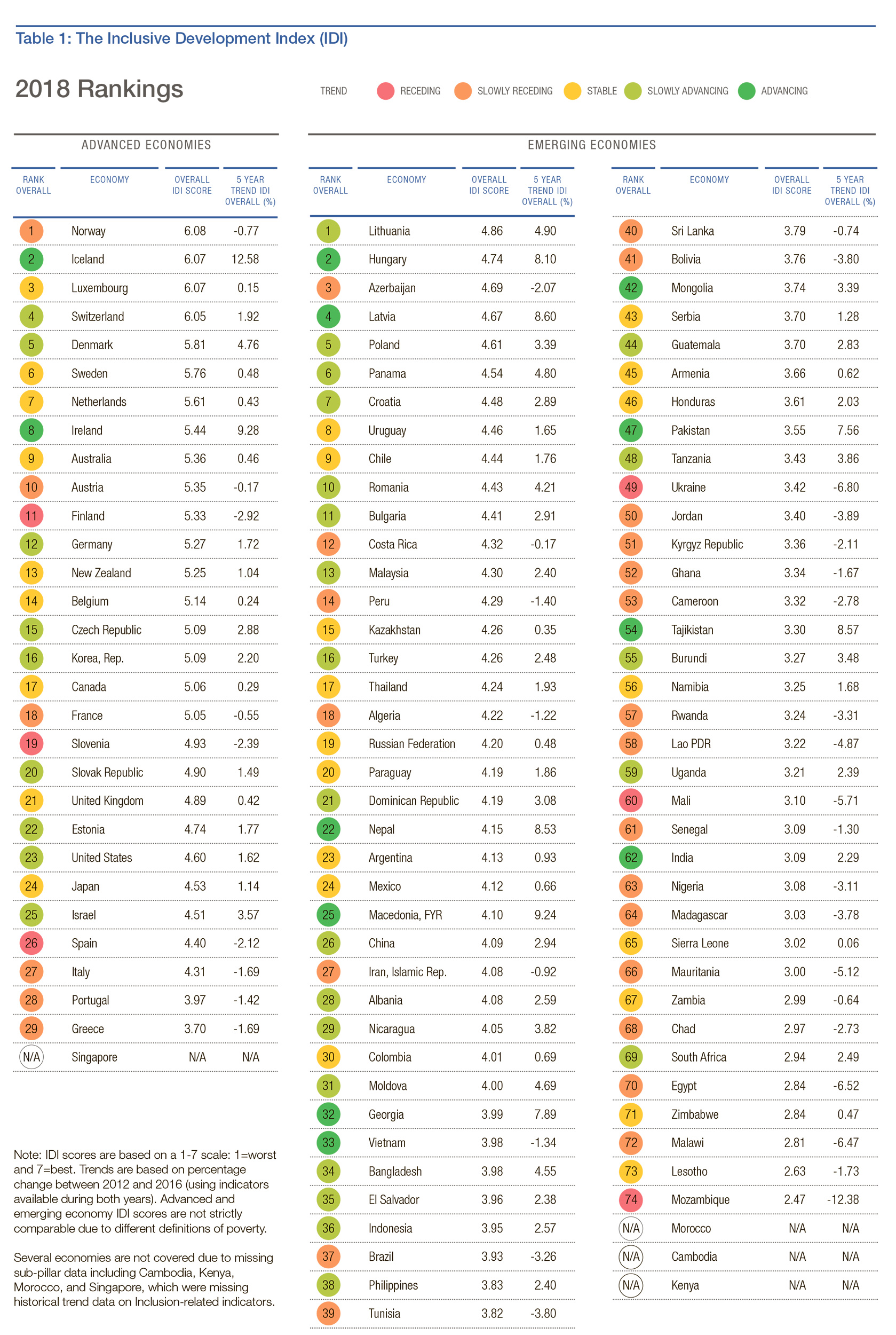 Страны в рейтинге разделены на две группы — развитые и развивающиеся. Все они получают итоговый «коэффициент инклюзивности» (от 1 до 7).