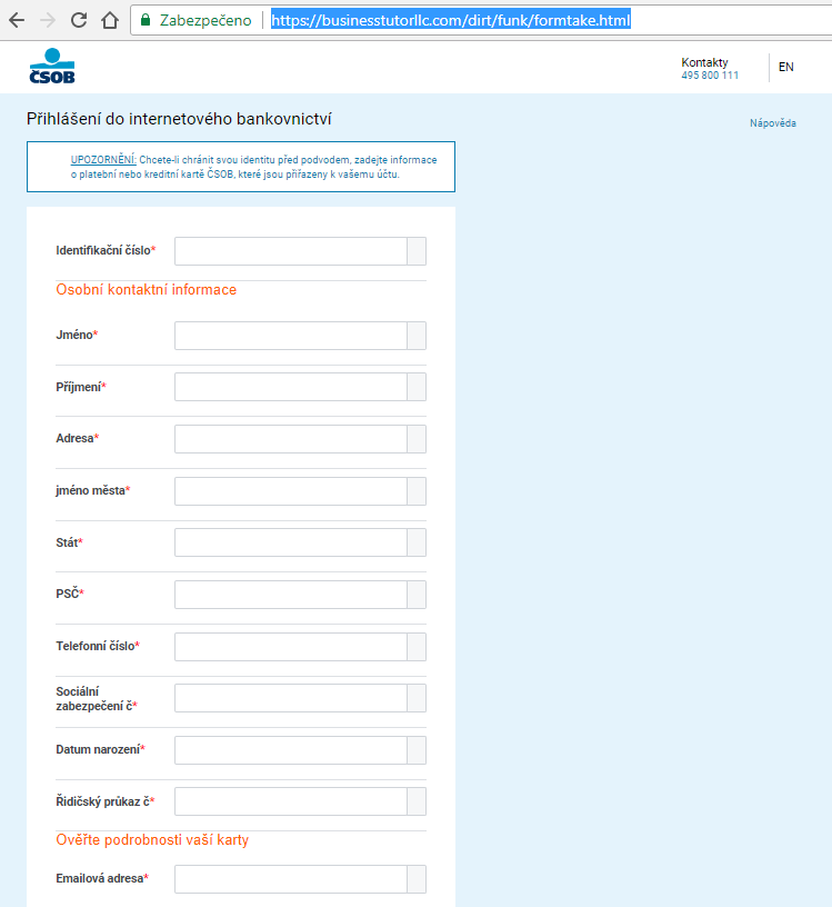 Эксперты отмечают, что в данном случае кибер-преступники действуют довольно примитивно – не маскируют адресную строку, и уже по ней можно понять, что речь идет о липовом сайте. Подлинная страница интернет-банкинга ČSOB имеет адрес https://ib.csob.cz.