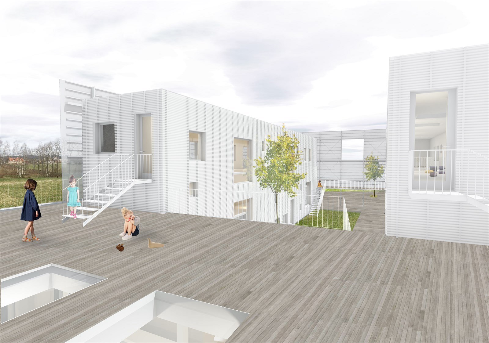 Чешский проект подразумевает строительство двух соединенных между собой корпусов, каждый высотой в два этажа. Стены здания получат множество окон. На крыше разместится терраса, где дети смогут свободно бегать и играть.