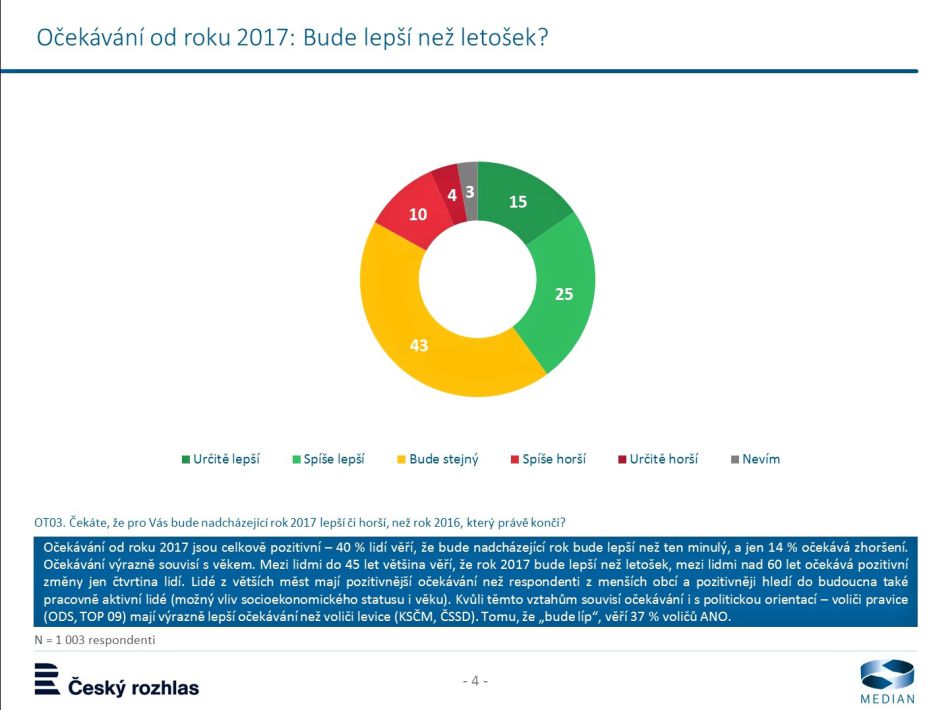 О том, что 2017 год будет лучше предыдущего, заявили 40% респондентов. Однако больше всего опрошенных чехов (43%) верят, что в целом новый год будет таким же, как и 2016-й.