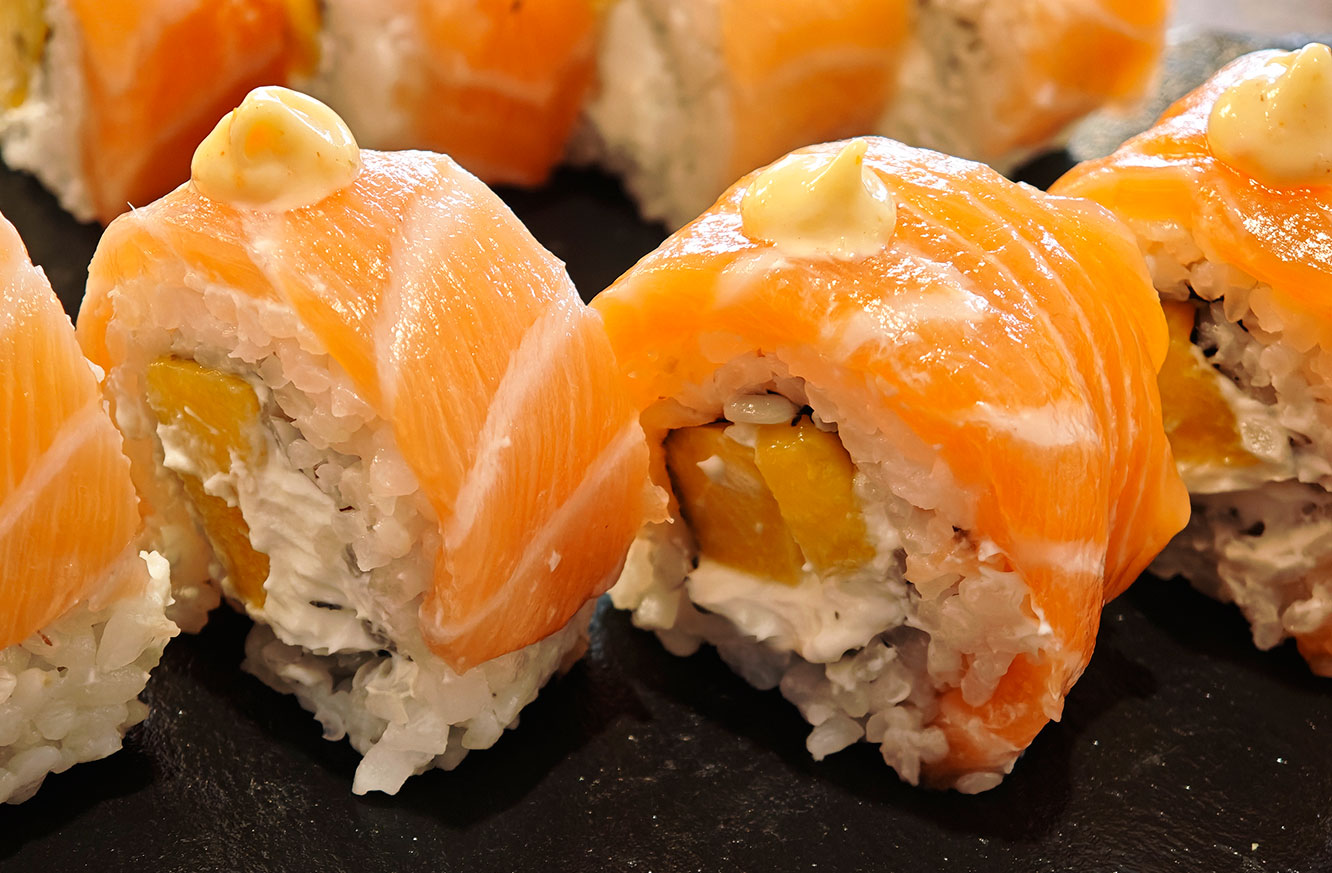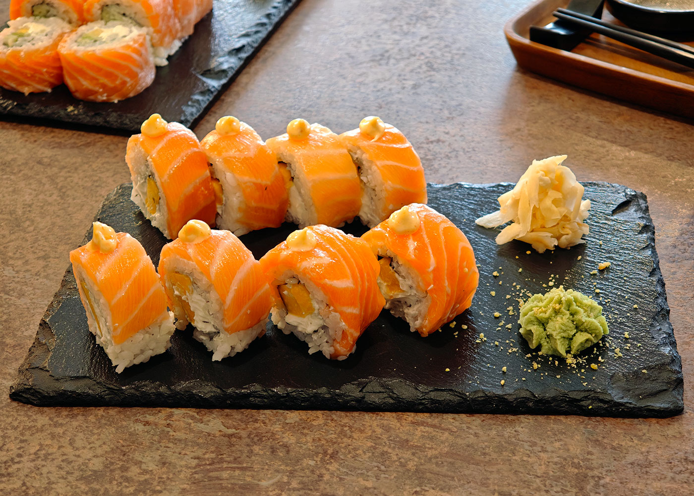 Mango Philadelphia Roll (399 крон) – с лососем, манго, сливочным сыром «Филадельфия» и манговым майонезом.