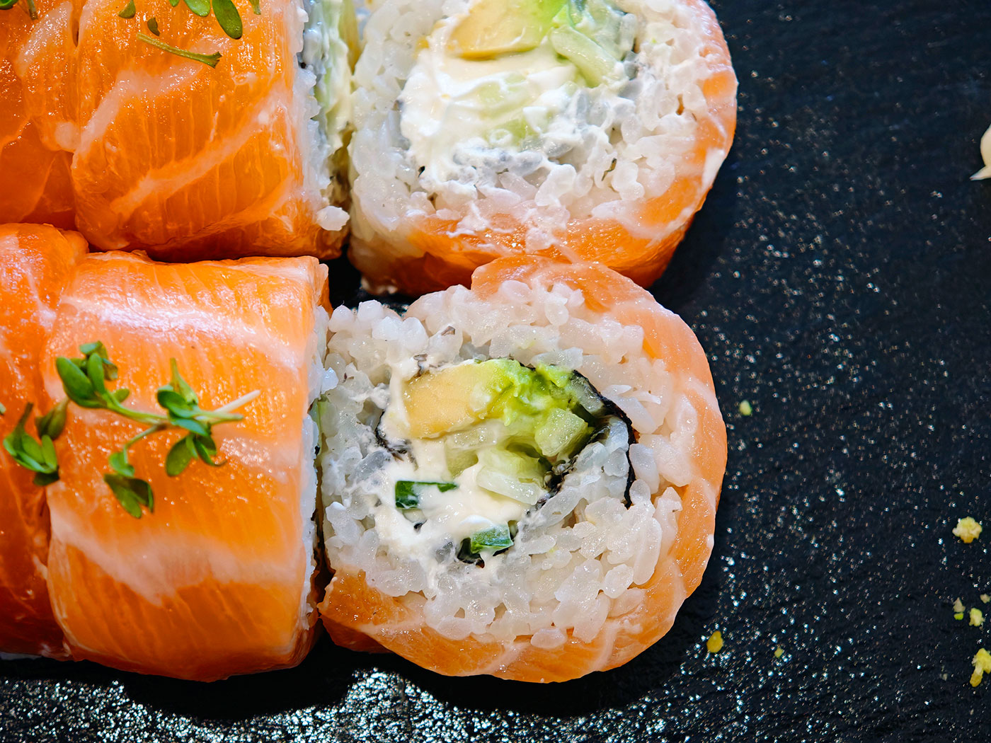 Philadelphia (329 крон) – с лососем, огурцом, авокадо и сливочным сыром «Филадельфия». Безупречная классика.