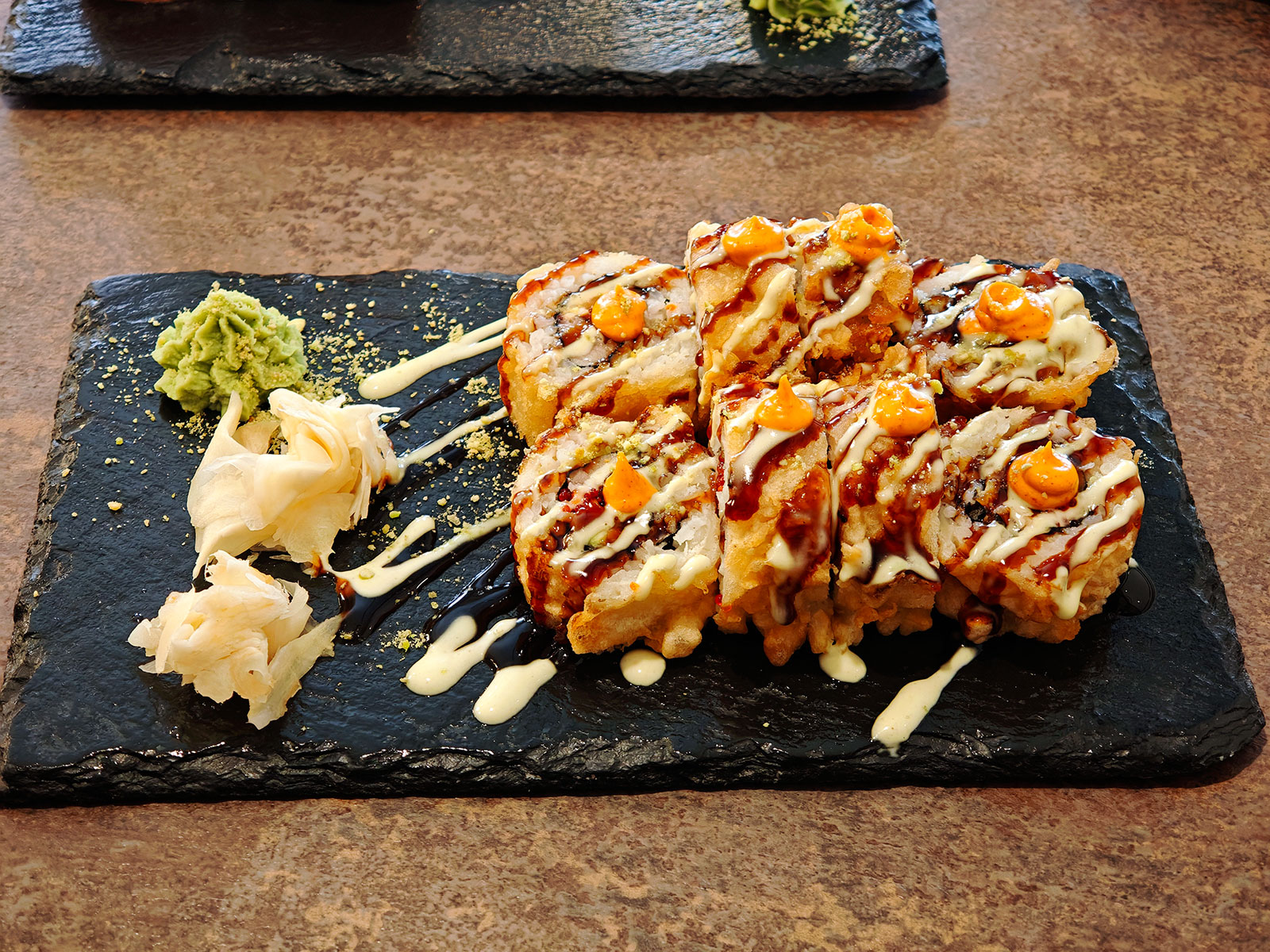 Fuji tempura roll (389 крон) – с тунцом, лососем, авокадо, икрой тобико, обжарен в темпуре и дополнен фирменными соусами.