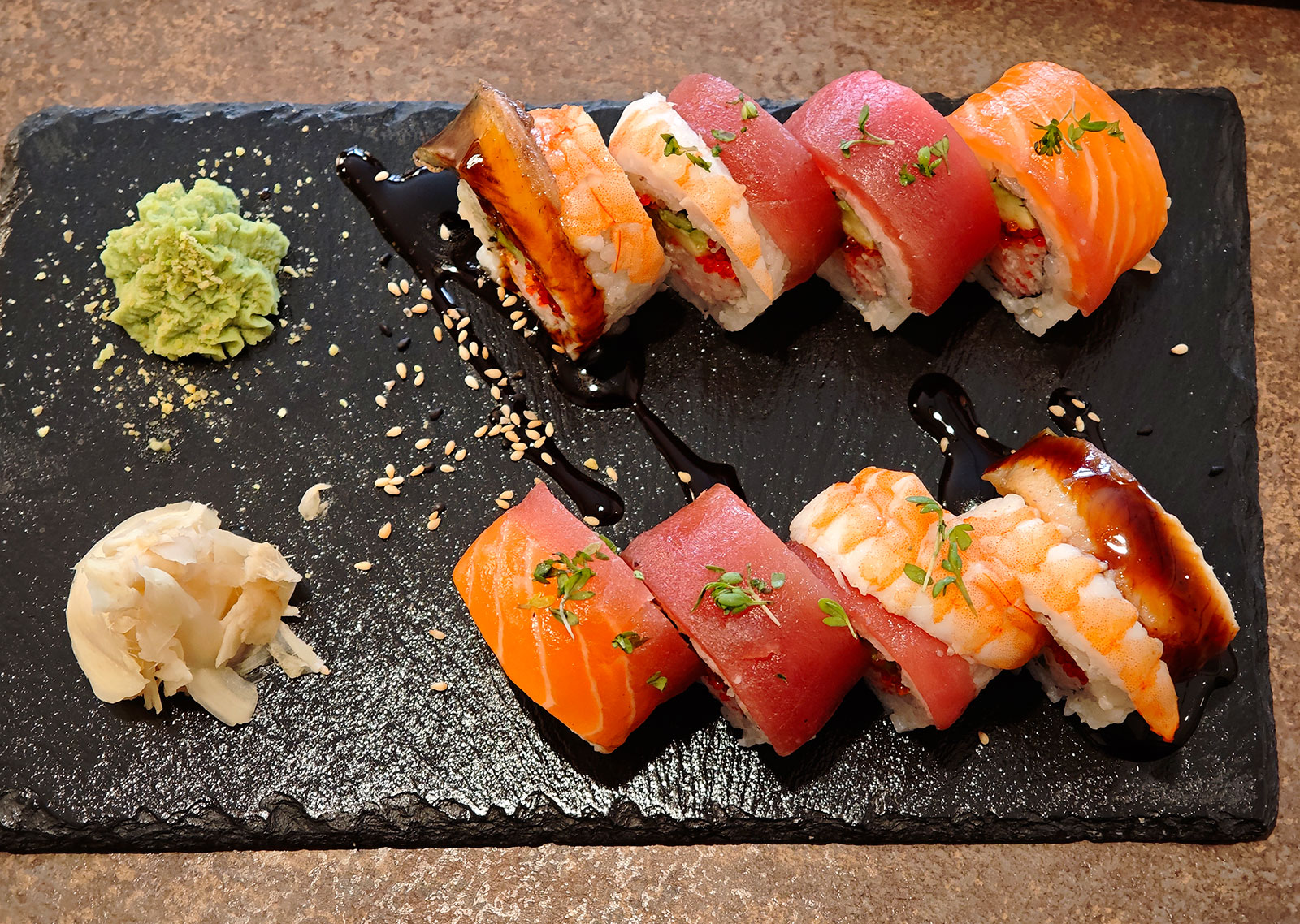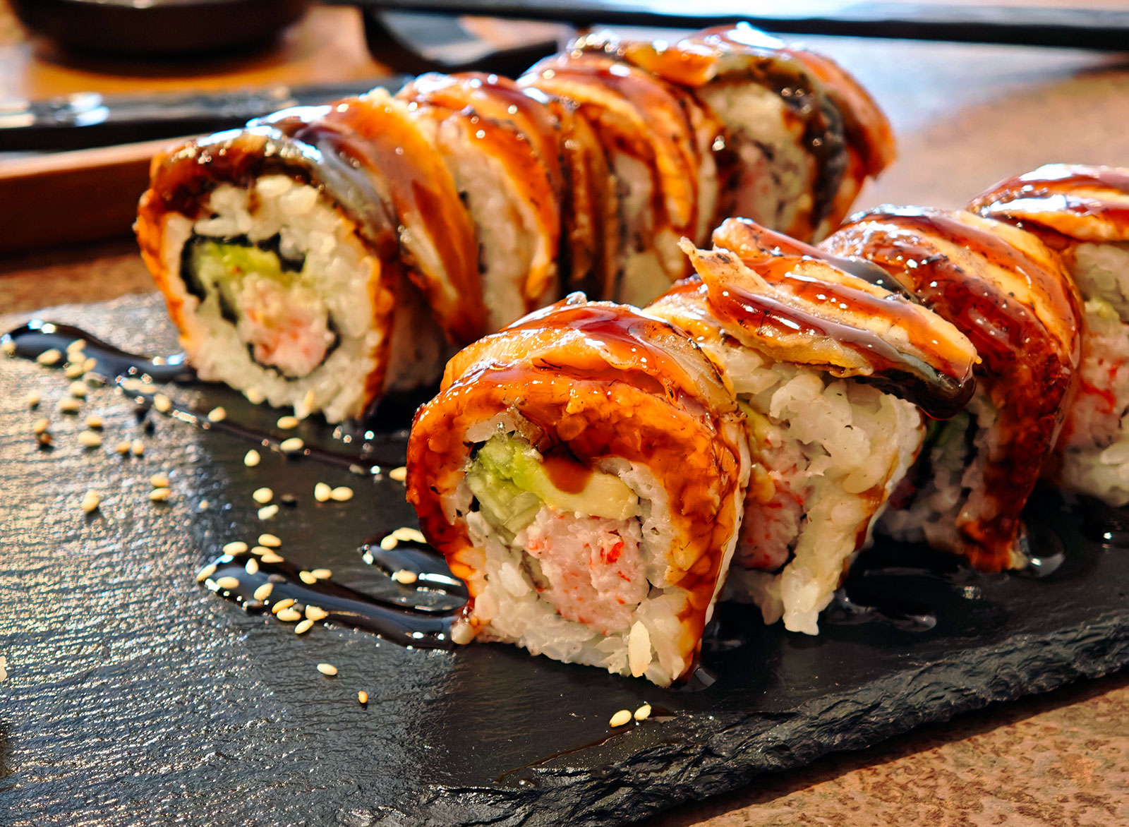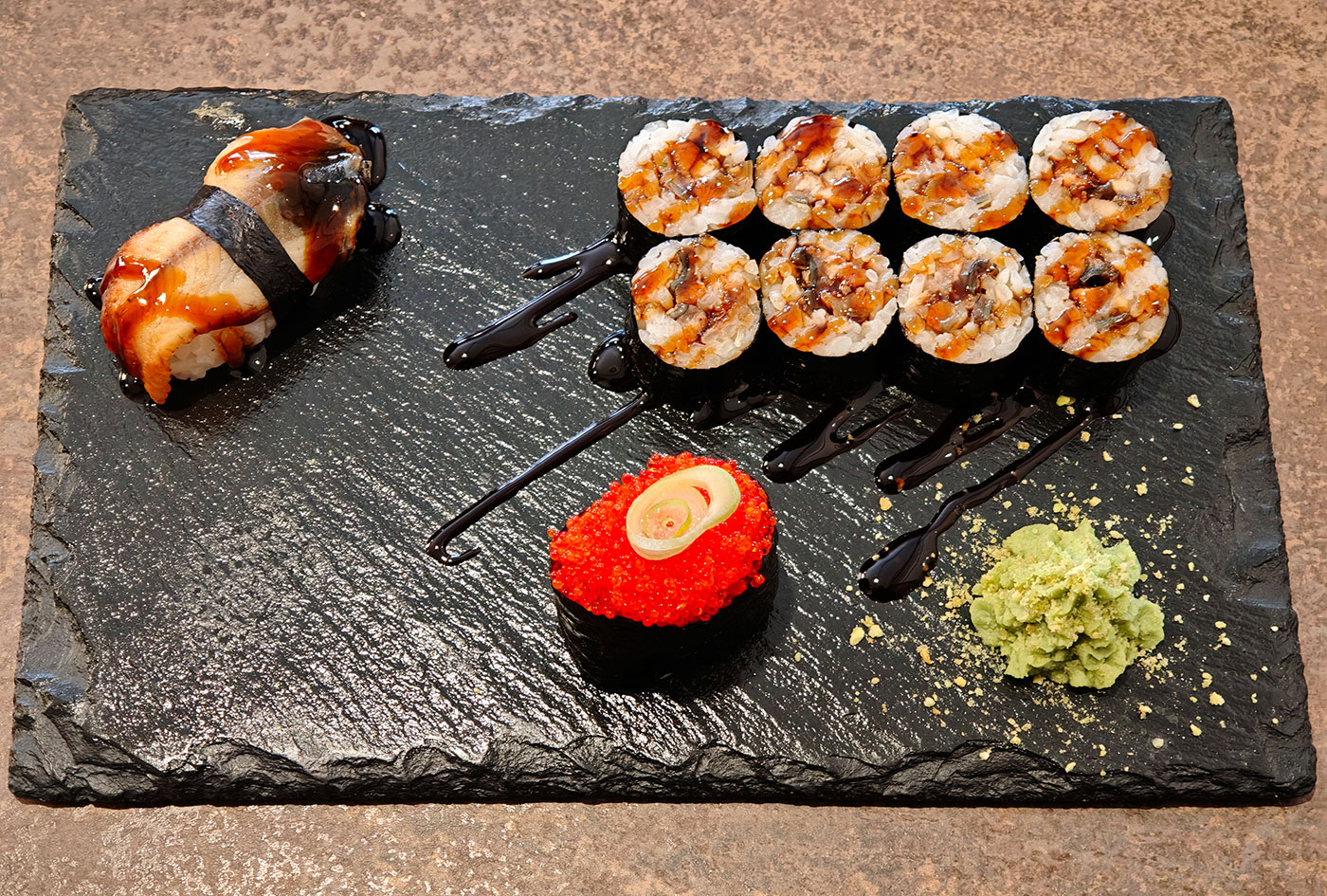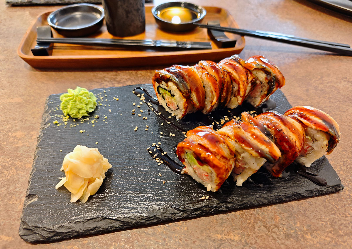 Dragon-Roll (389 крон) – с угрем, авокадо, крабовым кремом, огурцом и соусом унаги.
