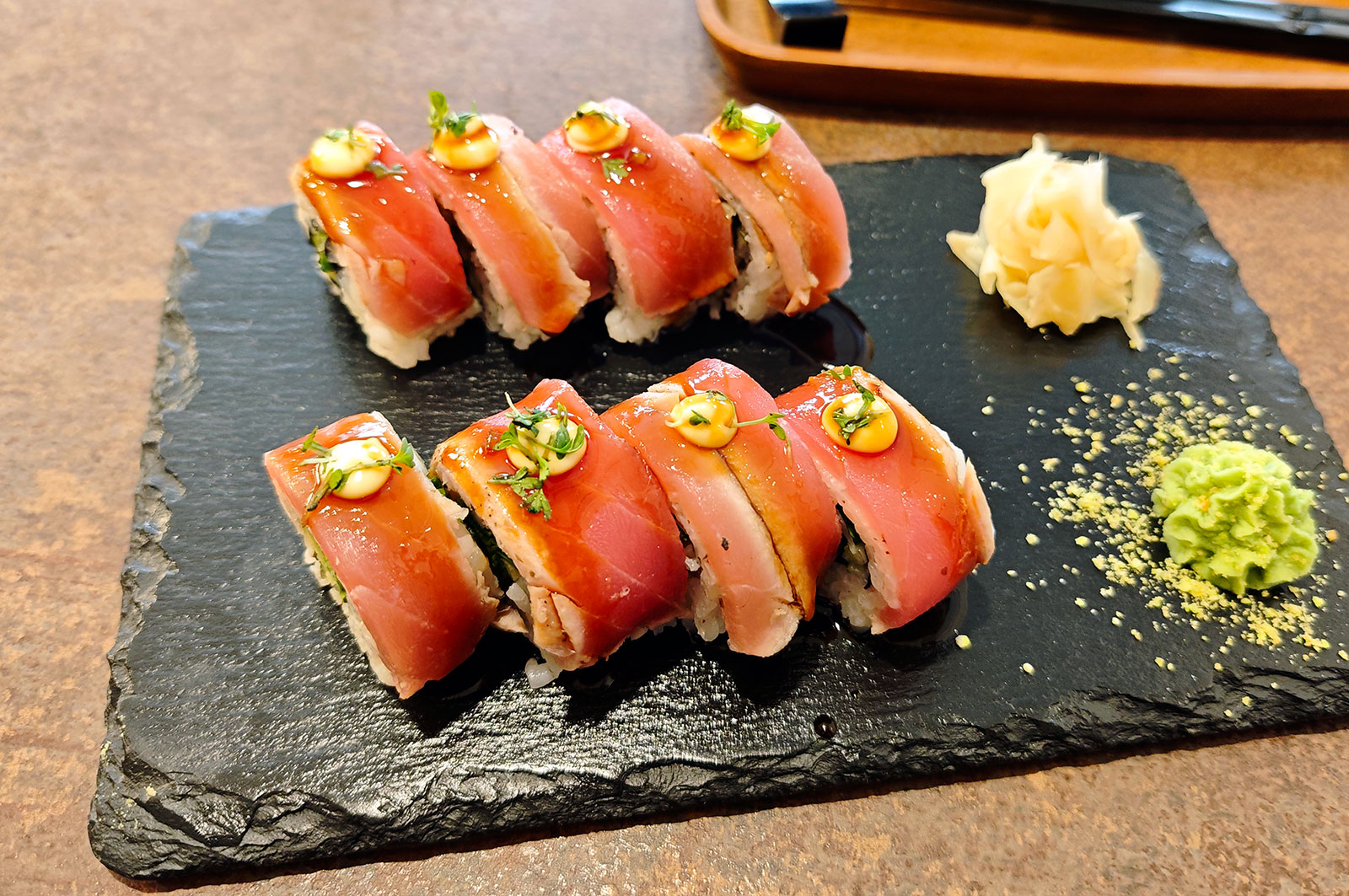Tuna truffle roll (419 крон) – с татаки из тунца, авокадо, огурцом, китайской капустой пак-чой, трюфельным майонезом и соусом васаби-понзу.