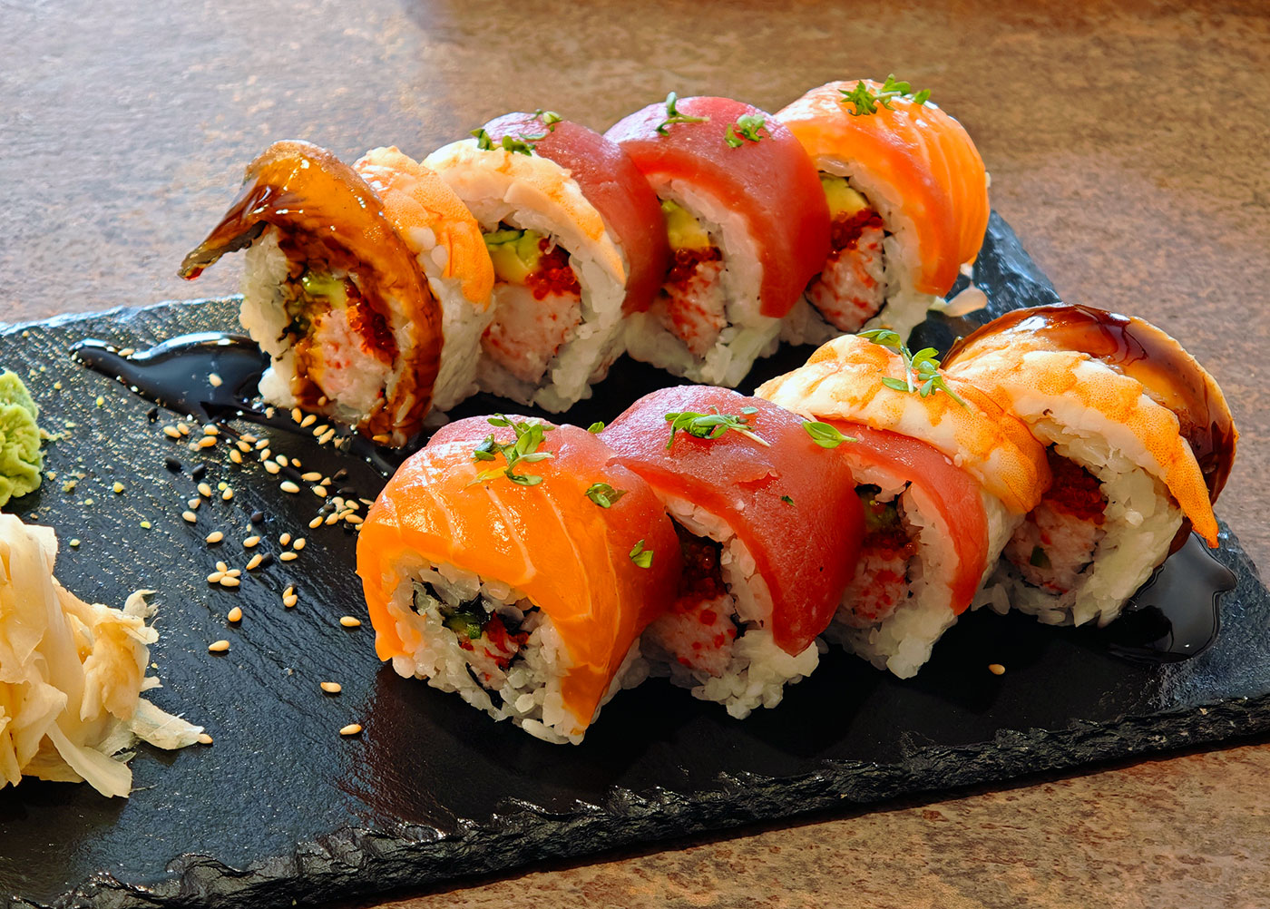 Rainbow roll (369 крон) – с тунцом, лососем, креветками, угрем, икрой тобико, крабовым кремом, огурцом и авокадо.