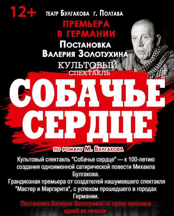 Театр Булгакова (г. Полтава) привезет в Прагу спектакль «Собачье сердце» в постановке покойного режиссера Валерия Золотухина. Представление состоится 23 ноября на сцене Divadlo Na Maninách.