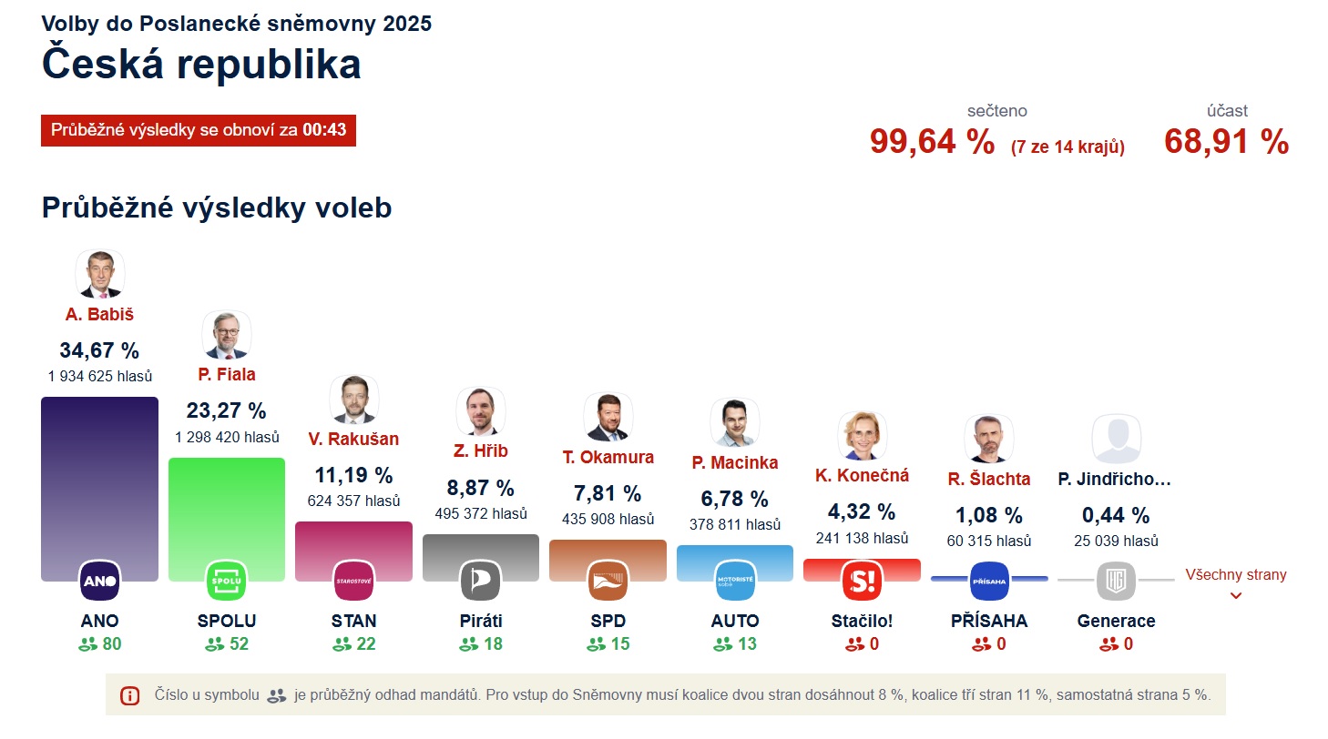 Чешское статистическое ведомство подсчитало более 99% голосов избирателей на очередных парламентских выборах. Теперь можно с уверенностью сказать, что позиции партий на картинке ниже не изменятся.