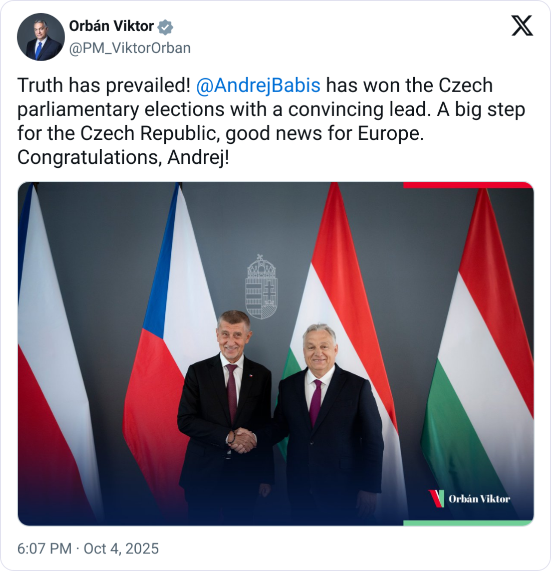 Это большой шаг для Чешской Республики и хорошая новость для Европы. Поздравляю, Андрей!», - написал глава венгерского правительства в соцсети X.