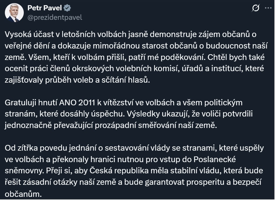 Желаю, чтобы Чешская Республика имела стабильное правительство, которое будет решать основные вопросы нашей страны и будет гарантировать процветание и безопасность гражданам», — написал глава государства в соцсети X.
