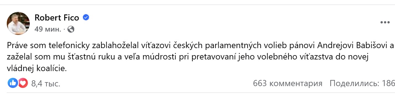 «Я только что позвонил победителю чешских парламентских выборов господину Андрею Бабишу и пожелал ему удачи и мудрости в претворении его избирательной победы в новую правительственную коалицию», - написал премьер-министр Словакии в Facebook.