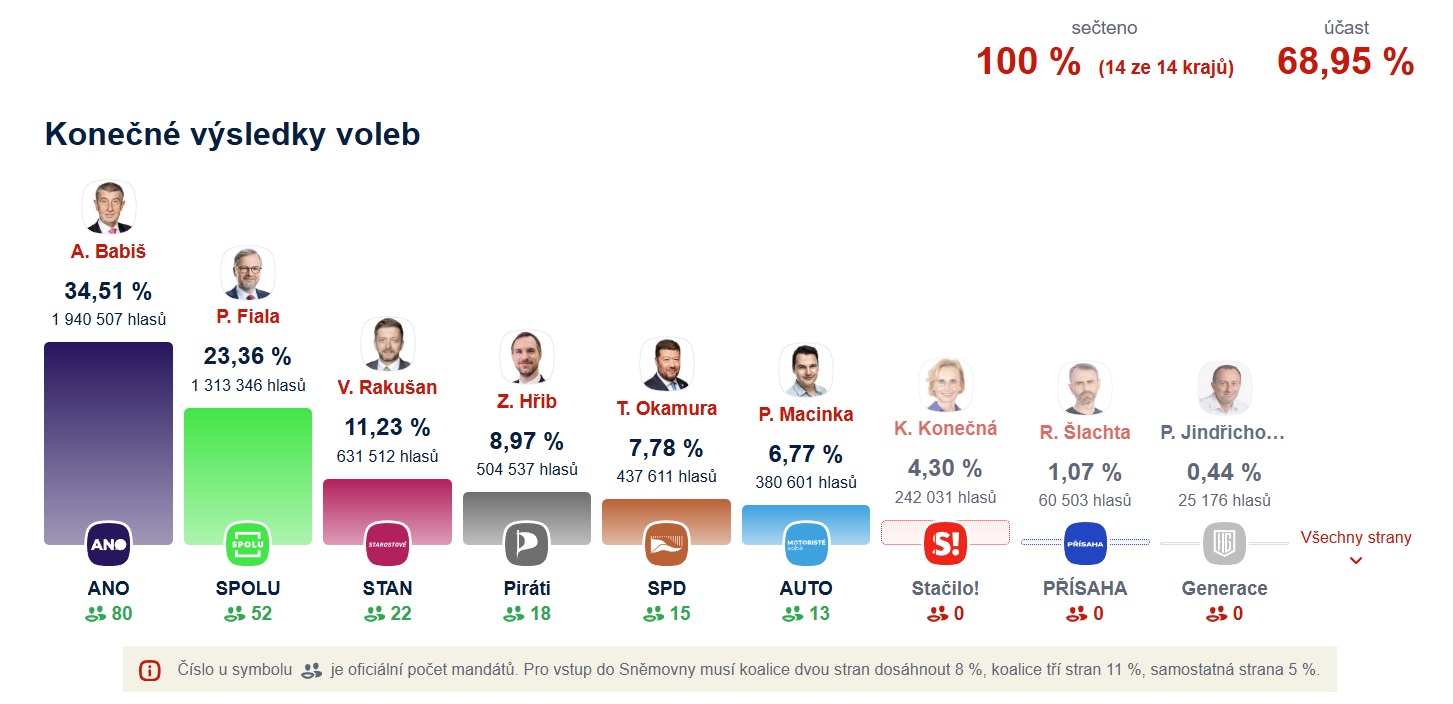 На участки пришли 68,95% из 8,25 млн избирателей. Это третья по величине явка на парламентских выборах с момента образования независимой Чехии.