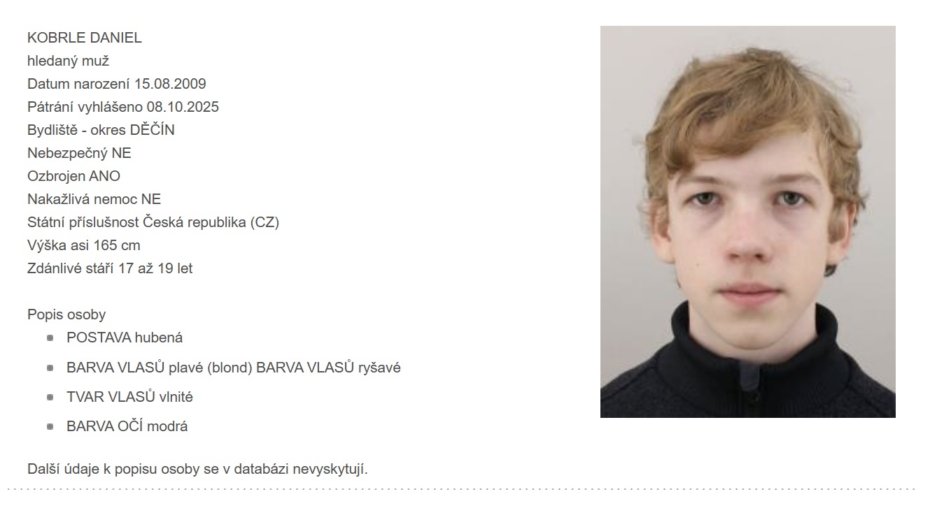 Чешская полиция объявила в розыск 16-летнего Даниэля Кобрле. Он подозревается в разбойном нападении, которое произошло утром 8 октября в городе Дечин.