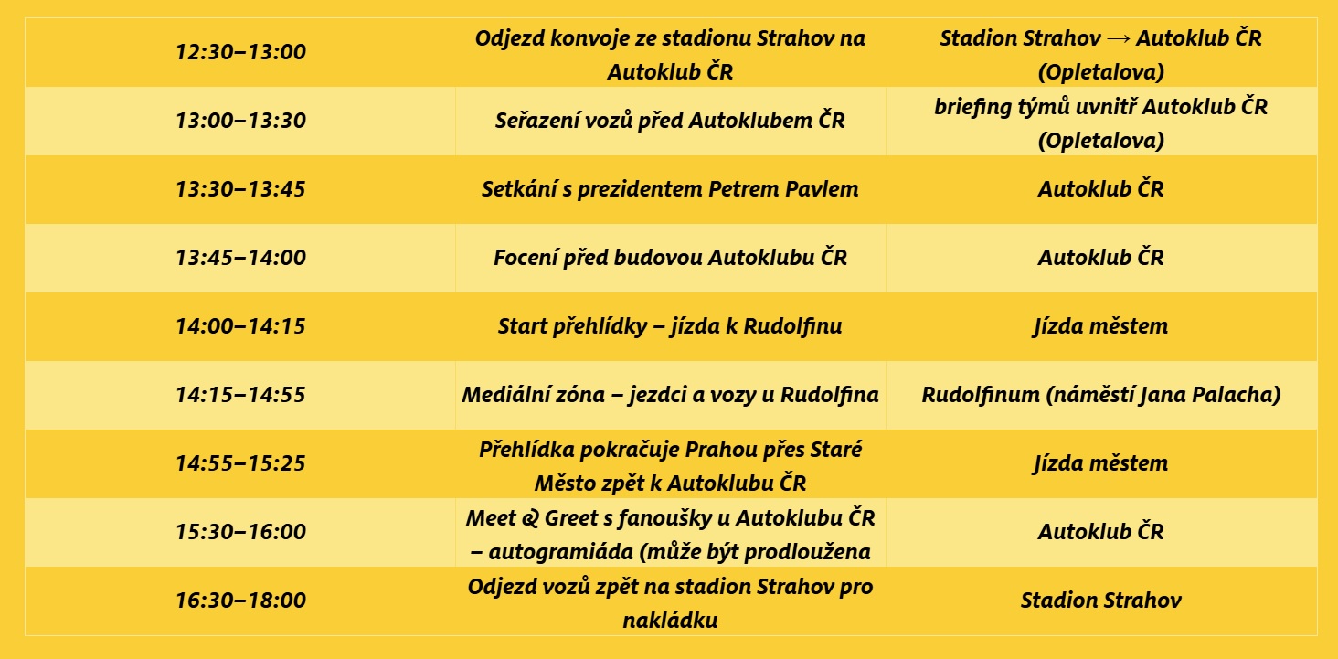 В 13:30 машины соберутся на улице Opletalova перед зданием Автоклуба Чехии, где состоится встреча с президентом республики Петром Павелом.