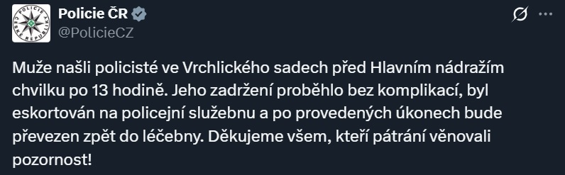 «Мужчину нашли около 13:00 в парке Vrchlického sady возле Главного вокзала. Задержание прошло без осложнений – он был доставлен в полицейский участок и после проведенных действий будет перевезен обратно в лечебное учреждение. Благодарим всех за помощь в розыске», – сообщили правоохранители.