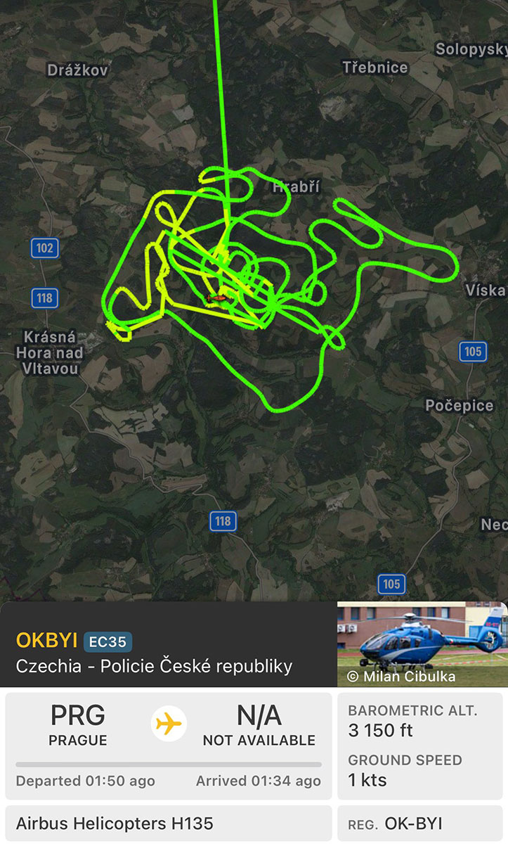 Его тут же принялись искать десятки полицейских, в том числе кинологи с собаками и вертолет с тепловизором на борту, прилетевший из Праги.