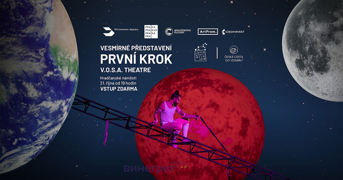 Во вторник, 21 октября, на Градчанской площади (Hradčanské náměstí) в центре Праги состоится красочное шоу «Первый шаг» (První krok) с тремя надувными моделями Солнца, Земли и Луны, а также с гигантскими парящими куклами и акробатическими трюками артистов V.O.S.A. Theatre.