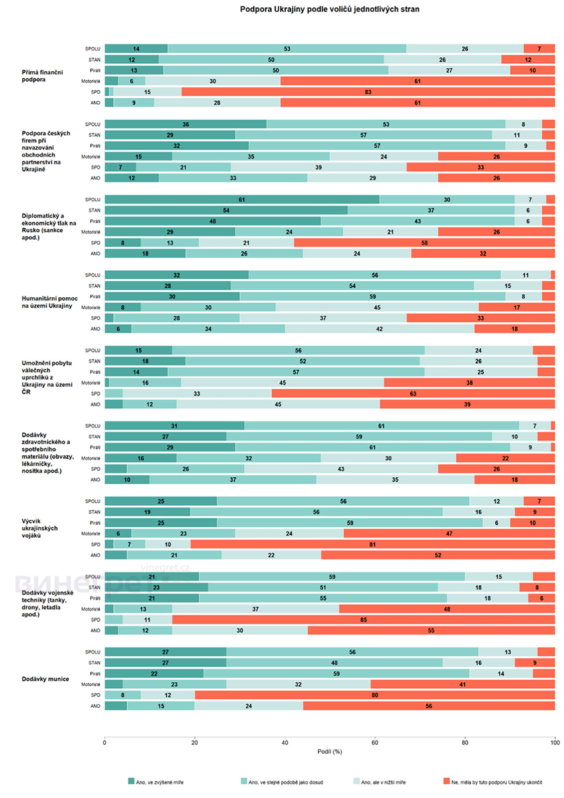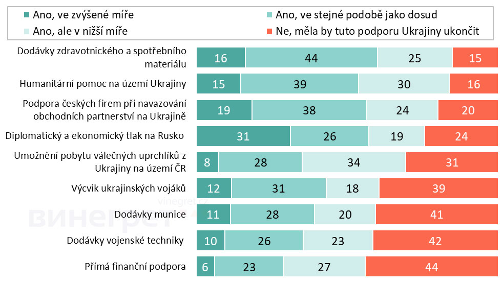 Из разделения по политическим предпочтениям респондентов следует, что избиратели движения ANO и партии Motoristé дальше поддерживали бы Украину поставками медицинских материалов и гуманитарной помощи, а также дипломатически и экономически ограничивали бы Россию. С другой стороны, подавляющее большинство прекратило бы прямую финансовую поддержку Украины. Избиратели ANO также отвергают поставки боеприпасов, военной техники и обучение украинских солдат.