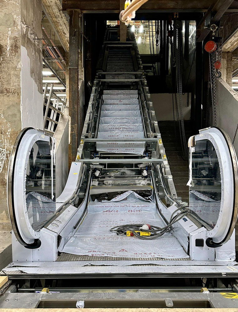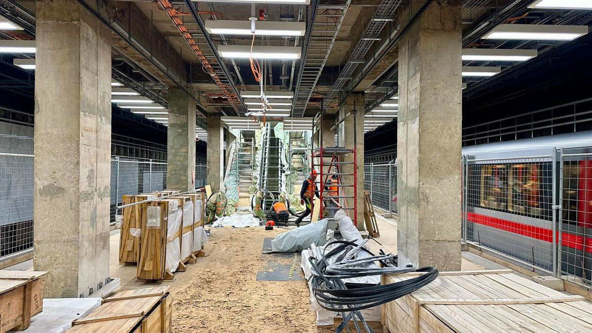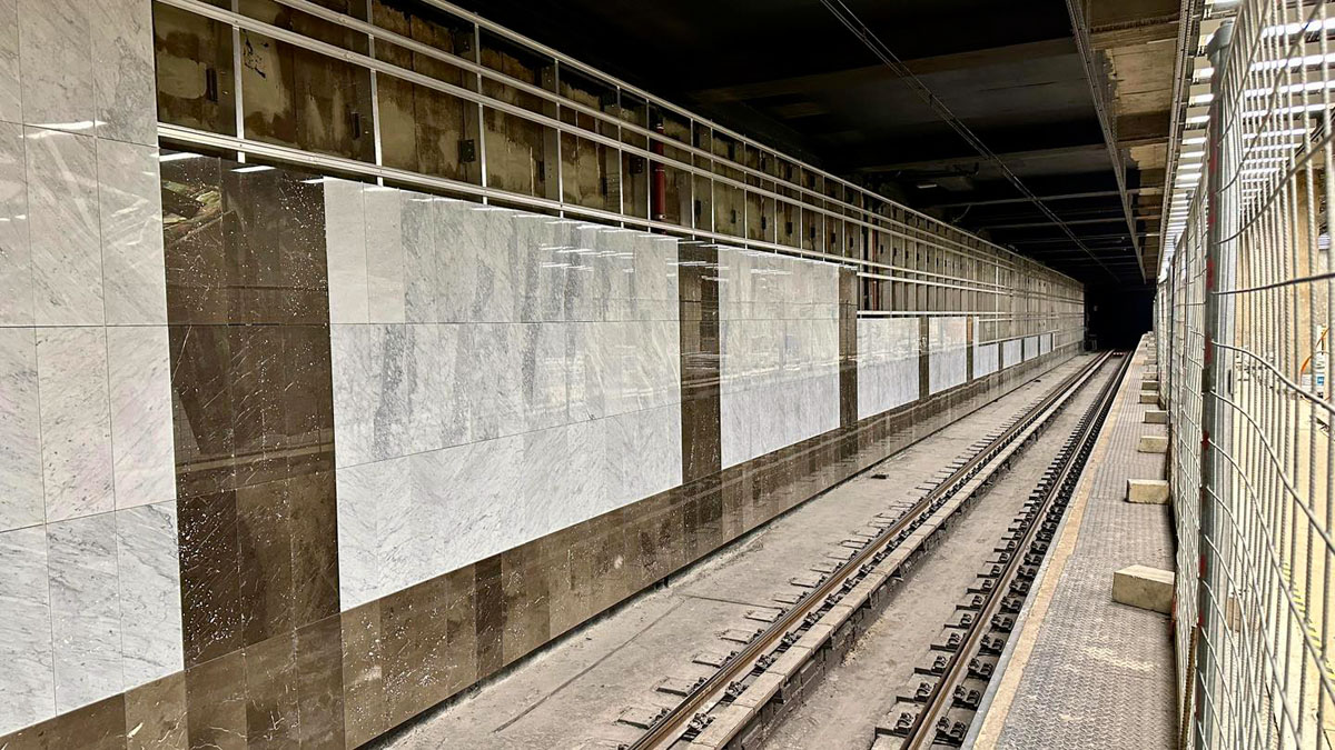 🔴 На платформе завершен монтаж освещения и начата установка подвесных потолков. Идет комплектация устройств связи, монтаж облицовочной плитки за путями и установка эскалаторов между платформой и вестибюлем.
