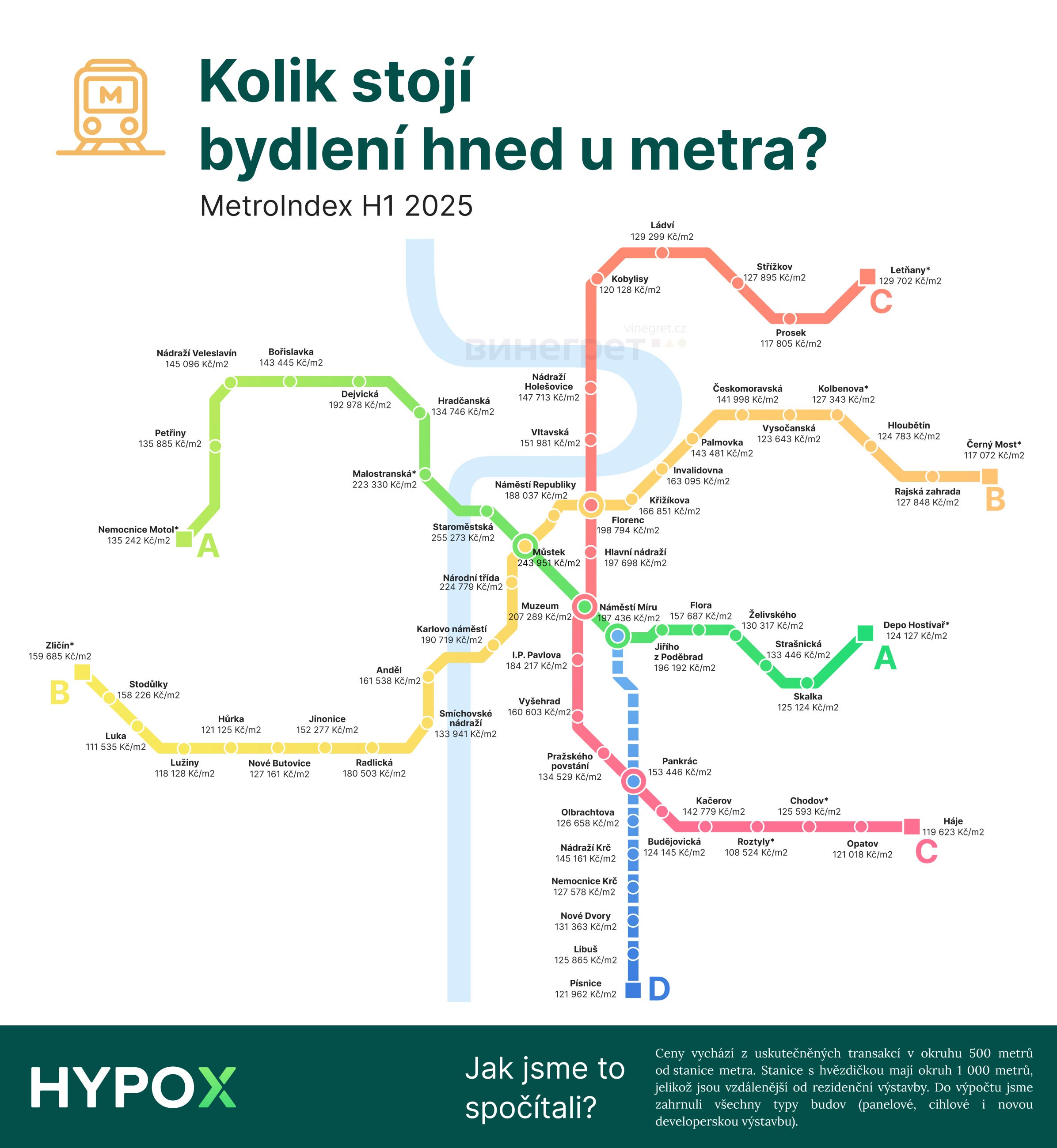 Сервис Hypox.cz представил карту средней стоимости квартир, расположенных в пределах 500 метров от станций подземки (для некоторых конечных станций радиус составляет 1 км).