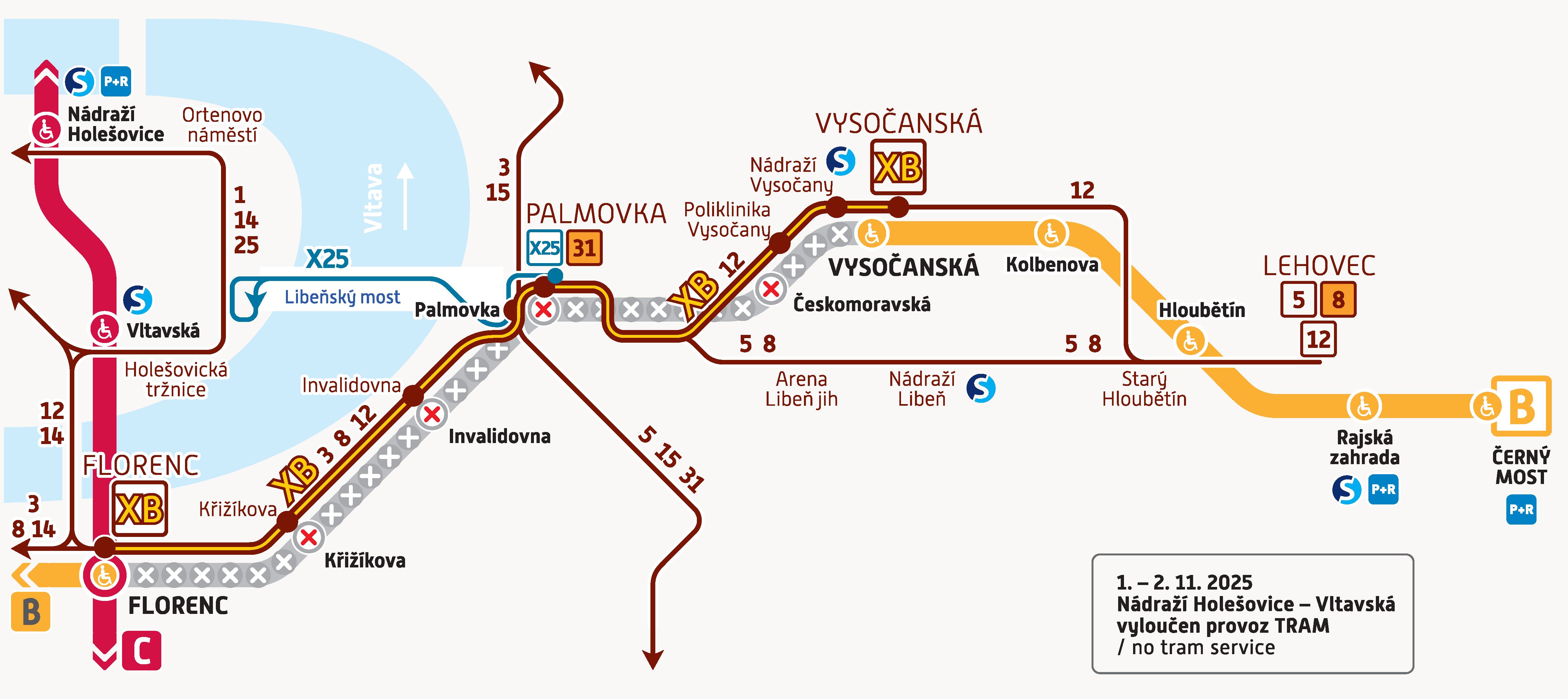 Для пассажиров будет организован компенсационный трамвайный маршрут «XB» со следующими остановками: FLORENC – Křižíkova – Invalidovna – Palmovka – Poliklinika Vysočany – Nádraží Vysočany – VYSOČANSKÁ.
