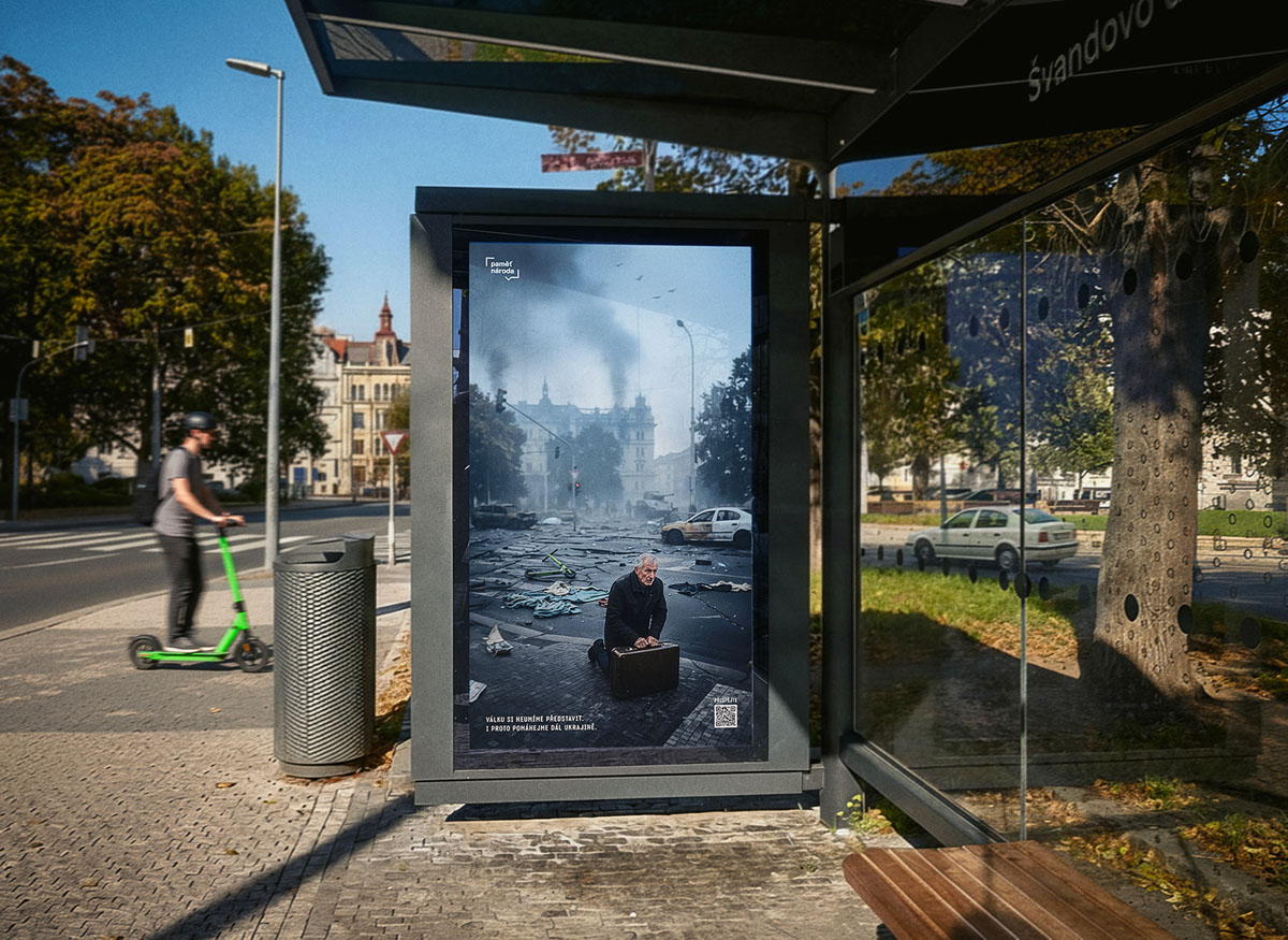 На нескольких оживленных местах в центре Праги появились баннеры с изображением того, как могла бы выглядеть конкретная улица, на которой находится зритель, в случае войны.