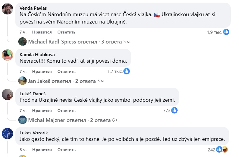 В комментариях пользователи данный призыв не поддержали. Суть самых залайканных высказываний сводится к тому, что на Национальном музее должен висеть только чешский флаг, на то он и национальный. Вывешивание украинского стяга было важным жестом солидарности в первые месяцы полномасштабной войны, но этот жест вовсе не обязан длиться вечно.