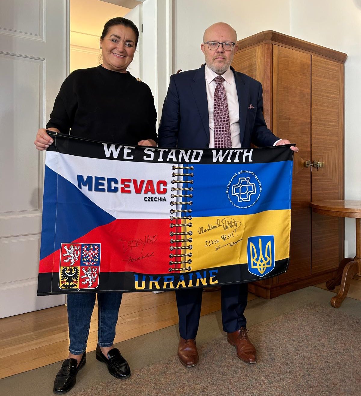 Наш флаг специфичен тем, что коллеги Матей Ондржей Гавел и Ондржей Коларж привезли его прямо из Украины, куда они доставляли помощь, на которую мы скинулись в рамках клуба. Он подписан непосредственно Валерием Залужным, который был генералом обороняющейся украинской армии.