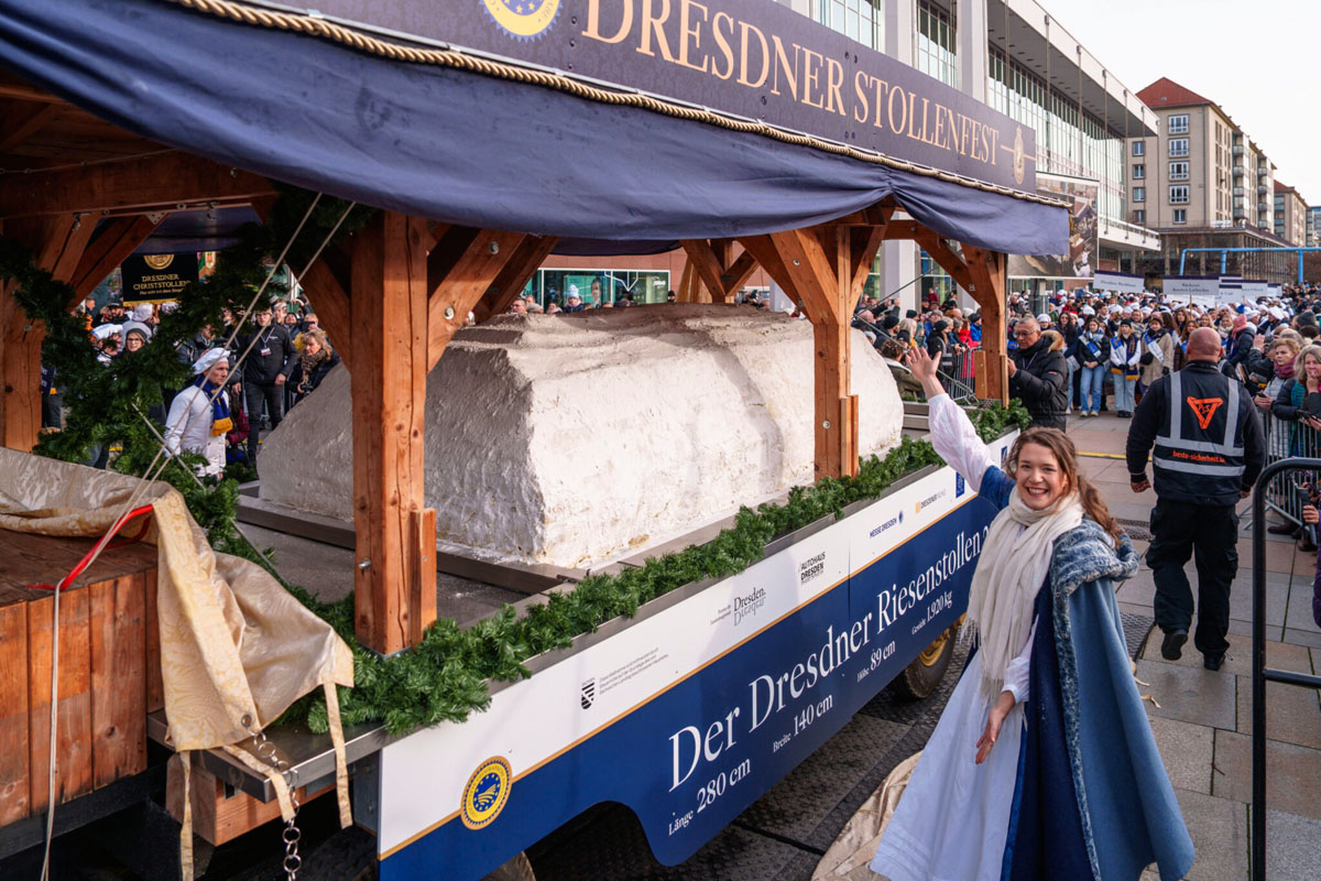 По улицам города будут проходить костюмированные процессии, гигантский штоллен повезут на специальной тележке, будет много музыки, танцев, акробатических выступлений и прочих проявлений радости, которые закончатся торжественным разрезанием штоллена.