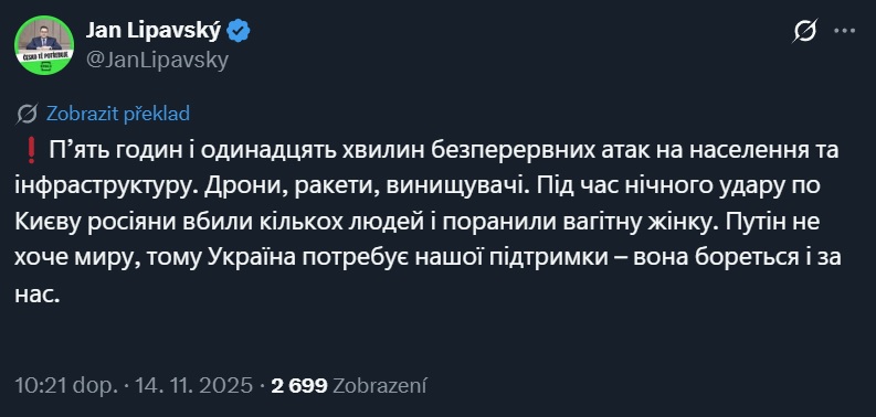 В пятницу, 14 ноября, министр иностранных дел Чехии Ян Липавский прокомментировал массированный удар российской армии по Киеву. Город атаковали ракетами и беспилотниками.