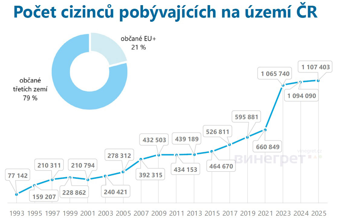 Самой многочисленной иностранной диаспорой в Чехии к 30 сентября 2025 года были граждане Украины – 593 922 человека (общая численность, включая беженцев). Это больше половины (53,6%) от всех проживающих в стране иностранцев.