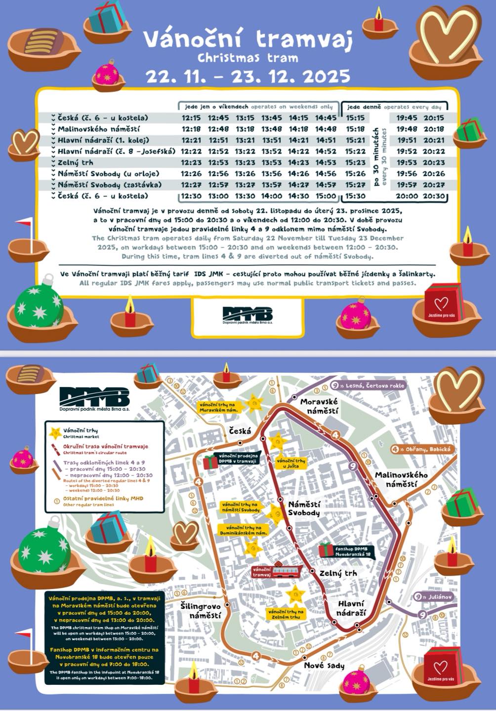 Праздничный трамвай будет курсировать по центру города с 22 ноября по 23 декабря 2025 года по специальному маршруту: Česká – Malinovského náměstí – Hlavní nádraží – Zelný trh – Náměstí Svobody – Česká.