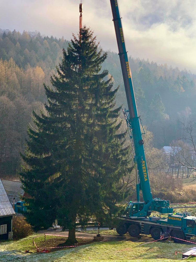 Елка более густая и симметричная, чем прошлогодняя. Для безопасности перед транспортировкой в Прагу ее укоротят до 23 метров. Это высота примерно соответствует семиэтажному дому.