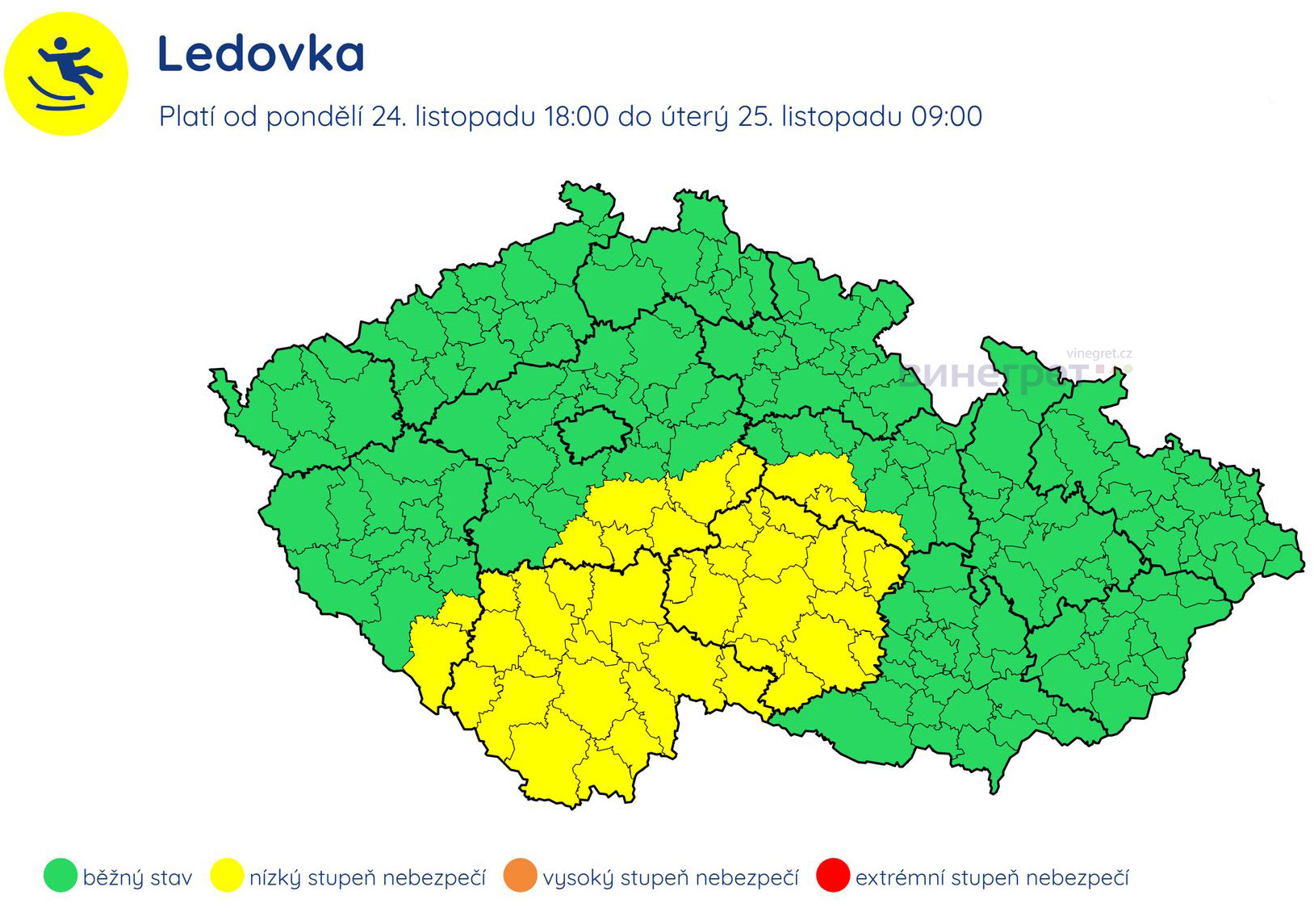Предупреждение действует с 18:00 понедельника до 09:00 вторника (25 ноября) для Высочины, Среднечешского, Южночешского, Пльзеньского и Пардубицкого края.