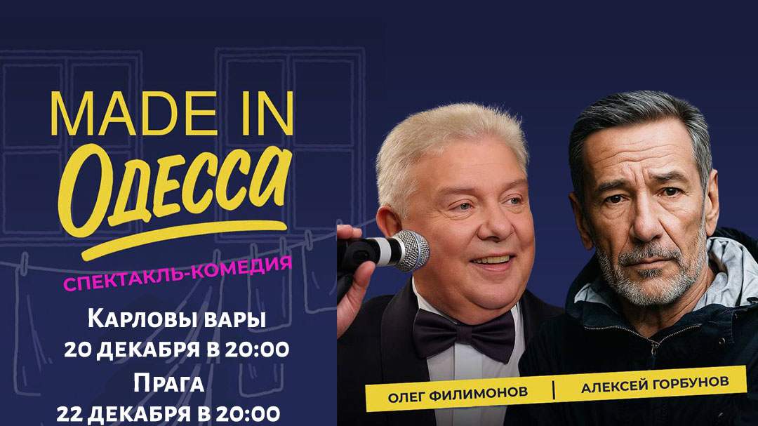 В Чехию привезут новый комедийный спектакль «Made in Одесса», главные роли в котором исполняют легендарные украинские актеры Алексей Горбунов и Олег Филимонов.